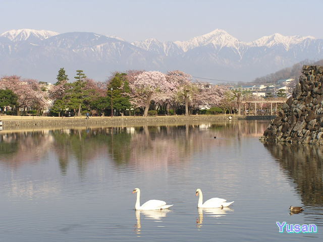 撮影2005年04月14日 木曜日早朝、城の桜と白鳥と鴨、アルプスも綺麗です。